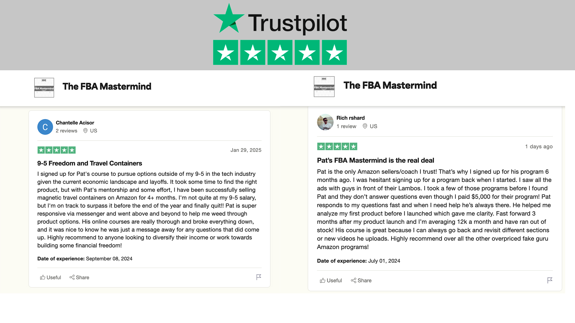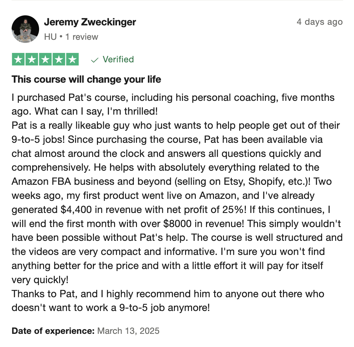 I’m a newbie to the business and can absolutely recommend! The course gives you all the information you need, both technical knowledge and mindset motivation, even if you don’t have any experience. He’s constantly updating it to keep up with the latest changes and makes a confusing and daunting process seem easy and straightforward. I also found that through the process it was super important to have access to the support of a community and Pat, through this fb group, is really generous with his advice. I initially got the course only and searched for my first product for several months, I thought I had found a good one but before investing I decided to upgrade to the mentorship, I’m glad I did and should have done it sooner because Pat saved me a ton of money and time. He’s the best teacher and mentor.