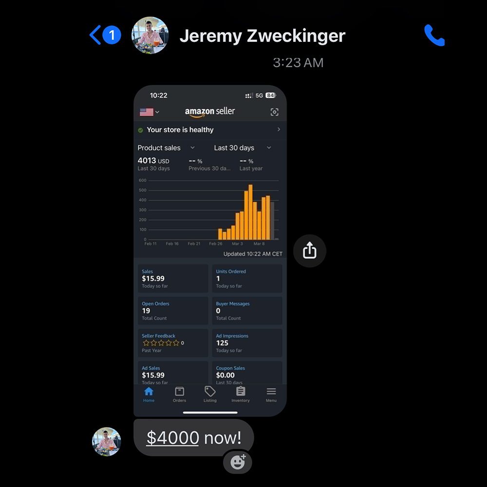 Jeremy launched his product (March 2025) on Amazon and hit over $4,000 in sales less than 2 weeks in! On track to hit $8-10k in sales his first month and already had to re order more inventory